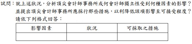 丙公司是一家生產重型機械的上市公司,由頂尖會計師事務所提供查核服務,頂尖會計師事務所共有八個合夥人,其中何會計師作為丙公司的主辦會計師達十年,非常熟悉該公司的管理和營運。近日,丙公司營運長要求何會計師於現任財務長申請產假期間尋找適當之代理人,何會計師決定推薦他的弟弟擔任此代理人。由於何會計師與丙公司之長期查核簽證關係,公司董事們已和何會計師成為好朋友,他們總是招待何會計師每年一同赴海外度假,因此何會計師已享受多年之海外免費旅遊。丙公司年度審計費用每年不斷增加,並已於近兩年占頂尖會計師事務所總收入超過40%。審計費用包括評價服務(10%)、理財服務(25%)及查核服務(65%)。 |